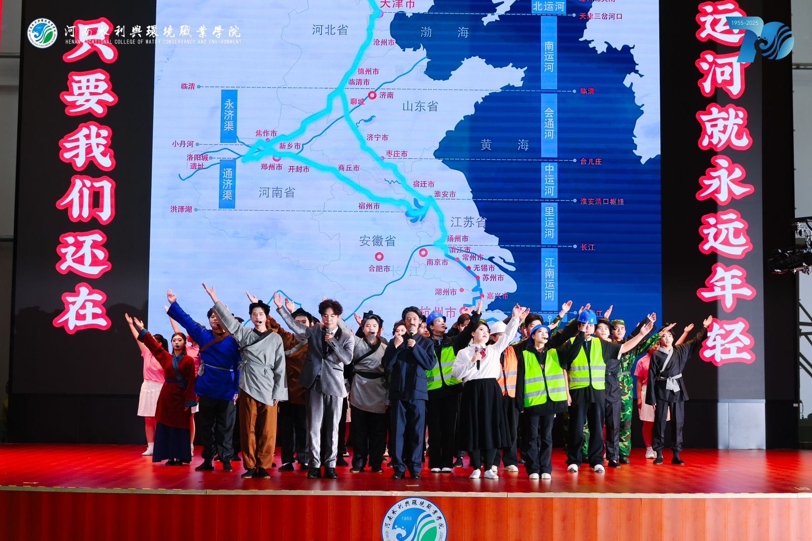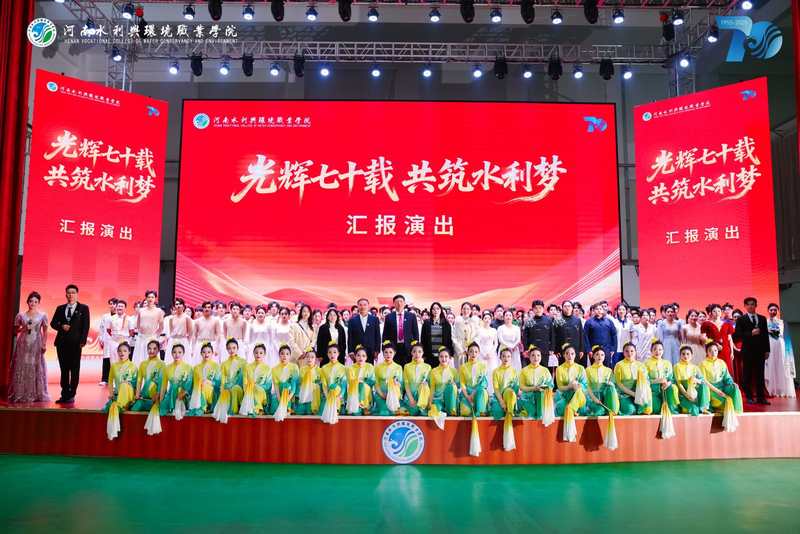 开幕式后,由大学生艺术团和来自各二级学院的学生带来的“光辉七十载 共筑水利梦”汇报演出正式开始。演出现场气氛热烈,节目内容精彩纷呈。舞台剧《时光的印记》以细腻的叙事手法,生动再现了从1955年白马寺初创到新时代跨越发展的峥嵘岁月,将几代水环人艰苦奋斗的场景一幕幕重现在观众眼前,令人动容。随后的歌曲串烧《岁月如歌》则通过不同时代的经典旋律,串联起七十年的光阴故事,引发了全场不同年龄段校友的深切共鸣。极具专业特色的情景剧《运河风华》,将古代水利智慧与当代治水精神巧妙融合,展现了水利人一脉相承的使命担当。大型舞蹈《万象更新 云程发轫》,则以恢宏的场面和充满力量的舞姿,寓意着学校在新起点上蓄势待发、前程万里的壮阔图景,将现场气氛推向高潮。