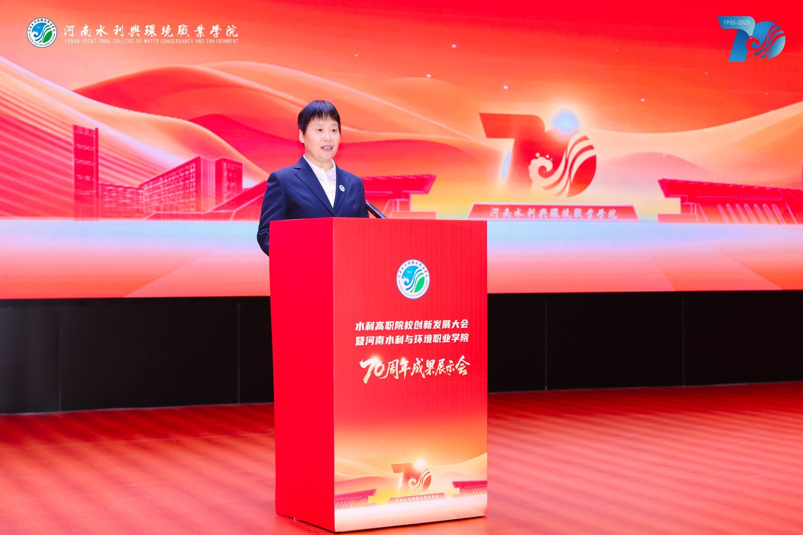 随后,校长李志萍发表了题为《深耕水利职教七十载 谱写创新发展新篇章》的工作报告。她系统梳理了学校从“因水而建”的初创期、“依水而兴”的发展期到“循水而进”的跨越期的奋进历程。从百业待兴的1955年到全面振兴的2025年,河南水环学院三迁校址、八易校名,在水利事业和职业教育事业由小变大、由弱变强的历史进程中,走过了初心如磐、薪火相传、求实奋进的70年。