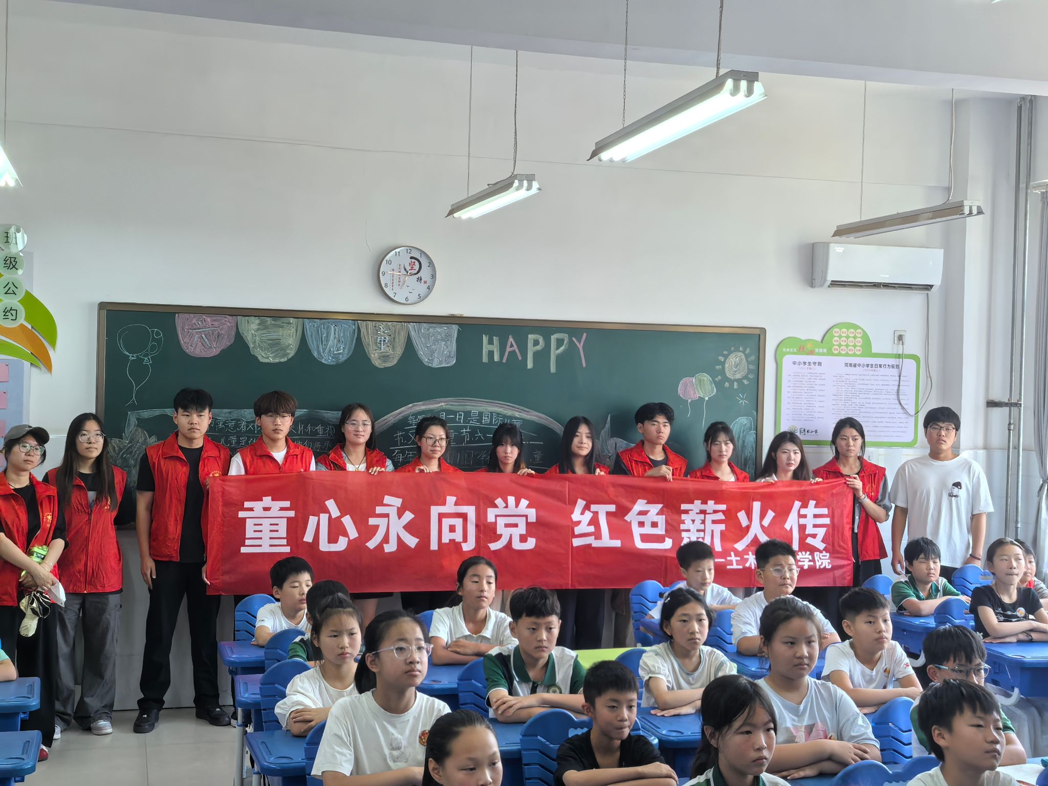 为积极响应国家关于传承红色基因、加强青少年思想道德建设的号召,在中国共产党成立104周年之际,土木工程学院志愿团于6月24日走进郑州航空港区艺术小学,开展了一场主题鲜明、内容丰富的红色宣讲活动,为小学生们播撒爱国种子,点燃理想信念之火。