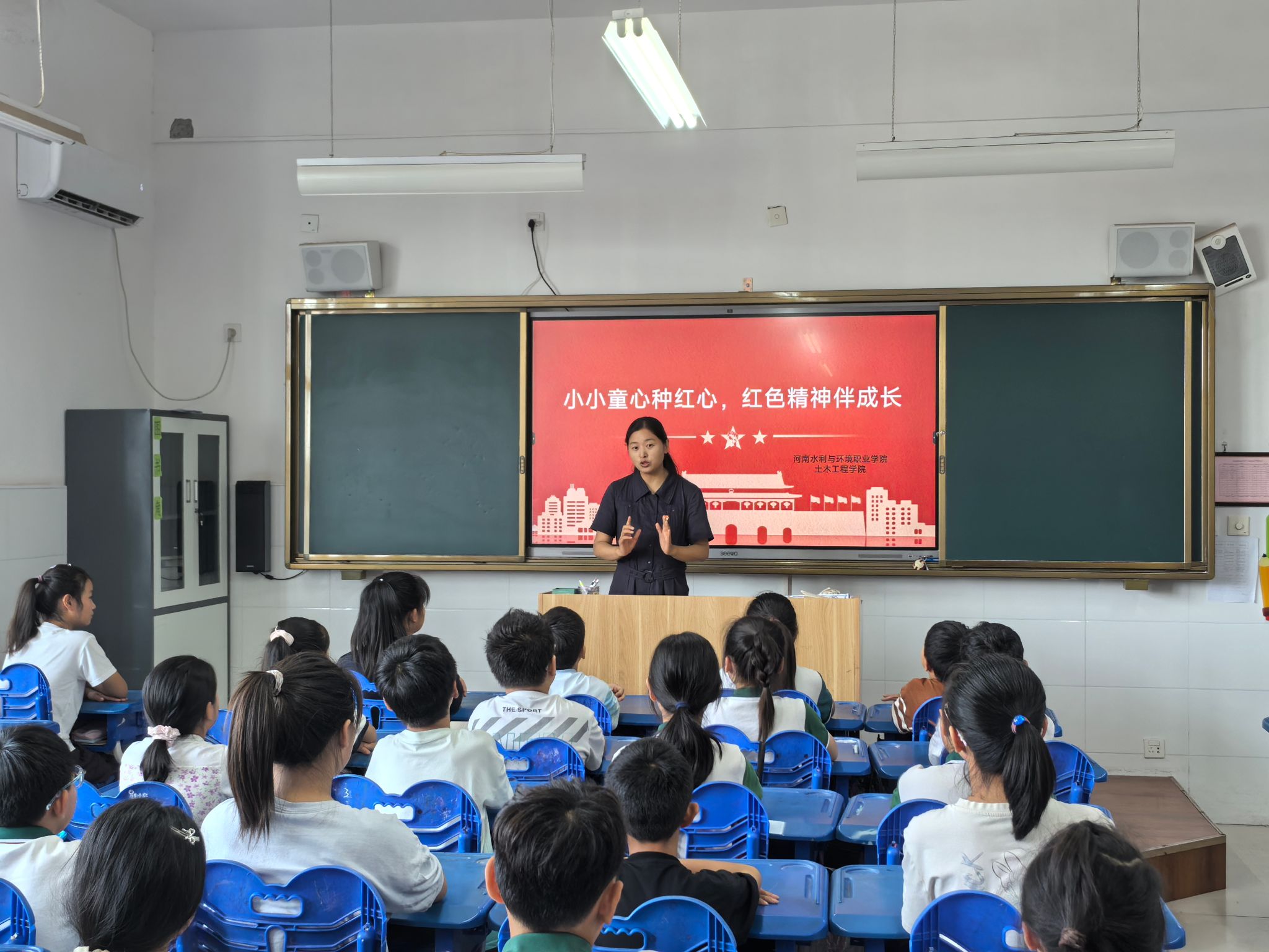 活动以“童心永向党 红色薪火传”为主题展开。土木工程学院团学办公室主任范玉通过生动感人的革命故事,将波澜壮阔的红色历史娓娓道来,从建党初期的星星之火到新时代的伟大成就,引领孩子们穿越时空,感受革命先辈的坚定信仰与家国担当。在互动环节,孩子们热情高涨,踊跃举手发言,争相表达对革命先烈的崇敬之情,分享自己对祖国的热爱与美好祝愿。童声稚语中饱含真挚情感,展现了红色精神在新时代少年心中生根发芽的蓬勃力量,彰显了建党精神在青少年群体中的代际传承。