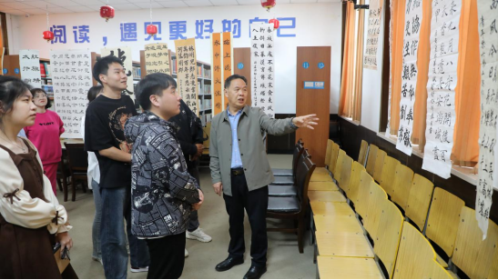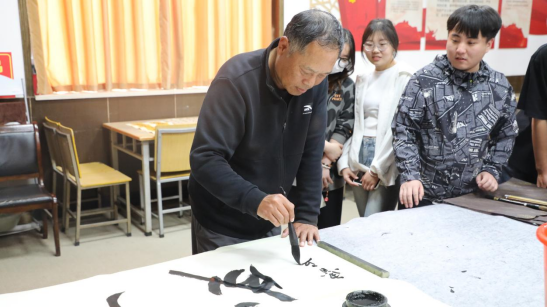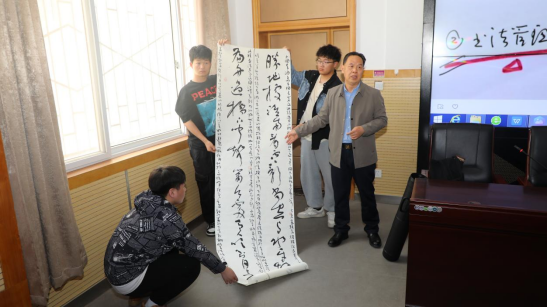 讲座结束后,书法家们来到学校书法社,对社员们创作的“共铸太行丰碑——学习弘扬红旗渠精神”主题书法作品进行现场点评,从字法、结构、章法、墨法和临创中需要注意的布局、浓淡、粗细、落款等创作元素进行了详细讲解,指出存在的不足和改进方法。书法家们还根据社员们的书法学习情况,围绕活动主题,进行了现场临创演示,并把创作的书法作品赠送给大家,鼓励大家要在实际行动中学习践行红旗渠精神,在书法艺术追求的道路上做到持之以恒,从艺术中获取灵感,激发奋进向上的力量。