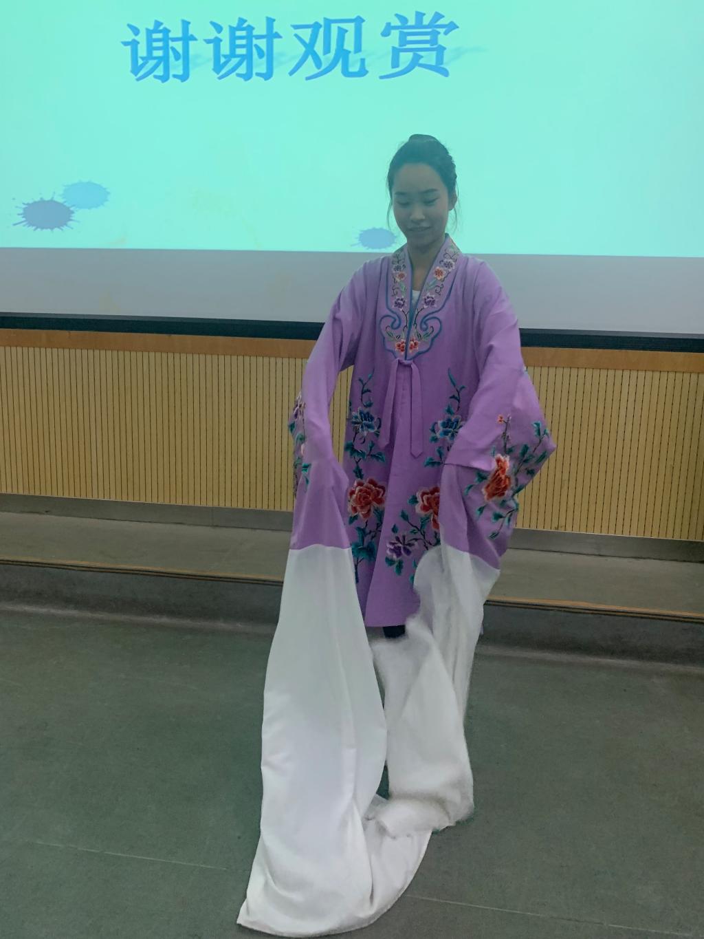 讲座中,廉玉柱介绍了中国戏曲发展脉络和戏曲艺术特征,讲解了戏曲中人物角色的行当分类——生、旦、净、丑,四功五法:唱、念、做、打、手、眼、身、法、步,强调了戏曲传承的重大意义。王亚博老师和他的学生们,边讲解边示范边互动,现场展示了戏曲基本功,赢得了在场学生的阵阵掌声。